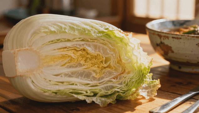 테이블 위의 신선한 봄동과 겉절이 김치