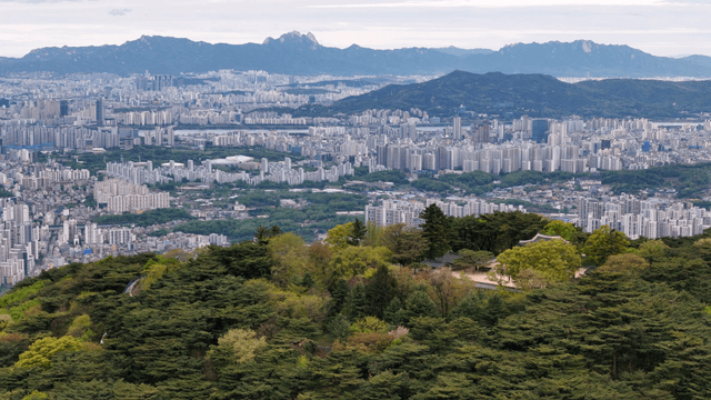 낮부터 밤까지의 대도시 서울의 전경과 하늘