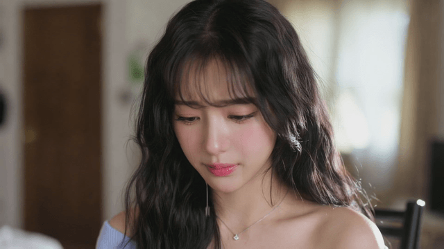 푸른 빛이 비치는 어두운 방에서 눈물을 흘리는 여성