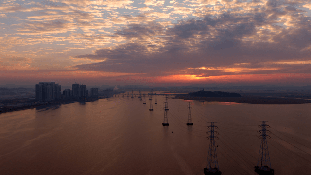 강 위 일몰을 배경으로 이어진 송전탑 전선