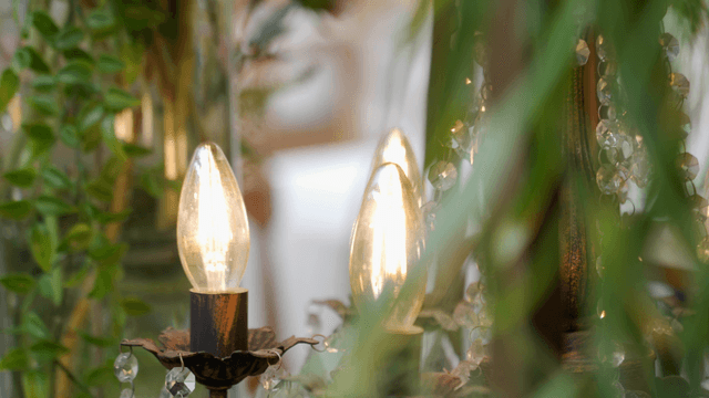 태양이 잘 드는 실내 공간에서 큰 잎들 옆에 매달려 있는 유리 식물 조명