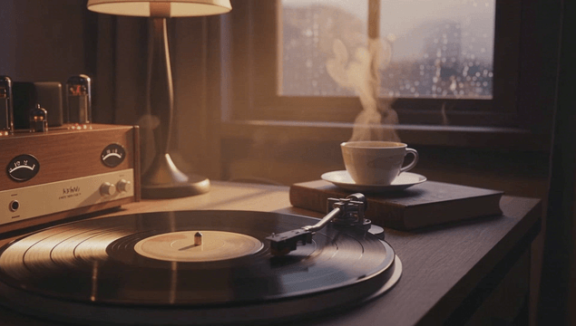 비 오는 날 레코드 플레이어가 있는 아늑한 방