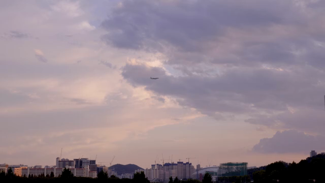 구름 낀 저녁 하늘을 지나가는 비행기와 도시 스카이라인