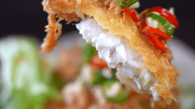 다채로운 고추 고명이 얹어진 바삭한 유린복 튀김