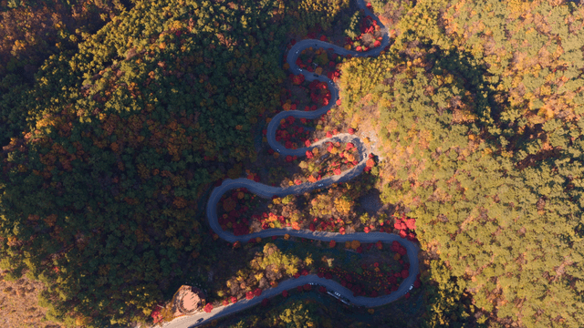 알록달록한 가을 숲을 지나는 구불구불한 도로