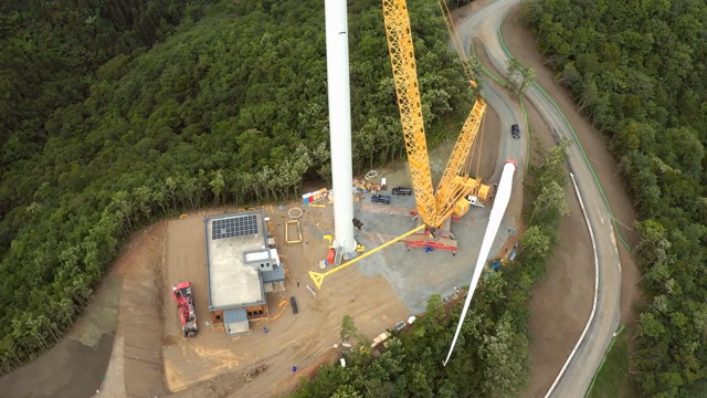 숲 속에서의 크레인을 사용한 풍력 터빈 건설 현장