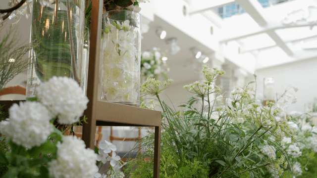 흰 꽃이 있는 실내 꽃꽂이