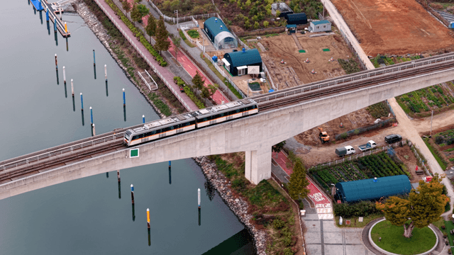 봄철의 따뜻한 풍경 속에 다리 위를 지나는 기차