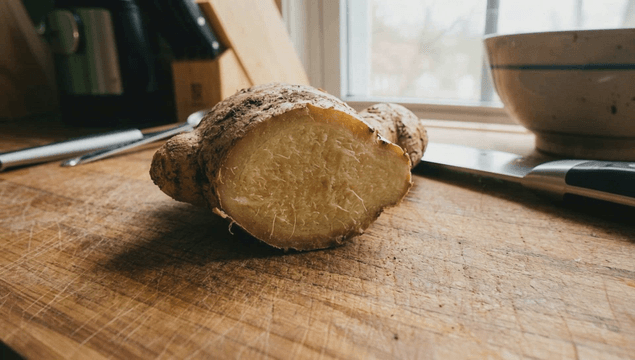 나무 도마 위의 신선한 생강