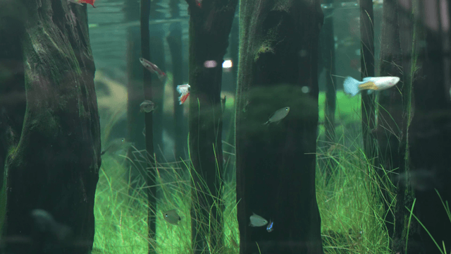 수조 속 녹색 잎 사이를 헤엄치는 물고기