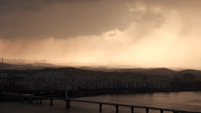 극적인 구름과 함께 해질녘 도시 스카이라인