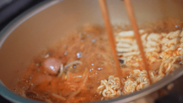 냄비에서 라면을 요리하는 장면