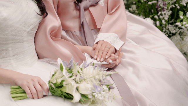 공원에서 서로를 바라보며 미소 짓는 신랑신부