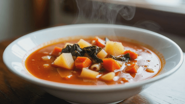 파스타가 들어간 야채 미네스트로네 수프 한 그릇