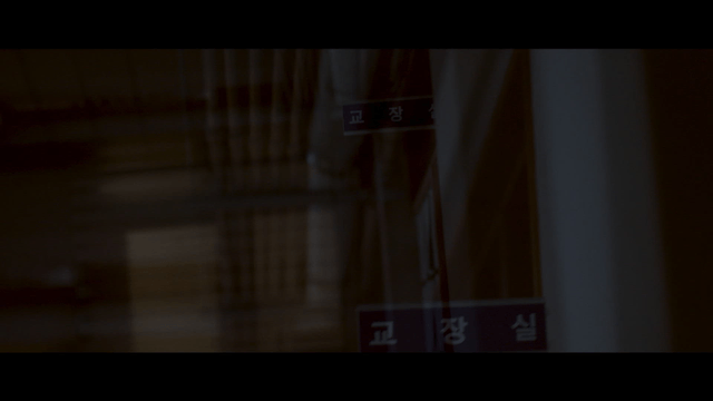 어두운 복도를 걷다 뒤돌아보는 남학생