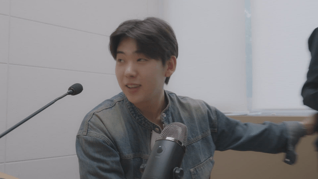 녹음 부스에서 대본을 내려놓는 성우
