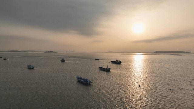 잔잔히 흘러가는 바다의 수평선 너머 일몰