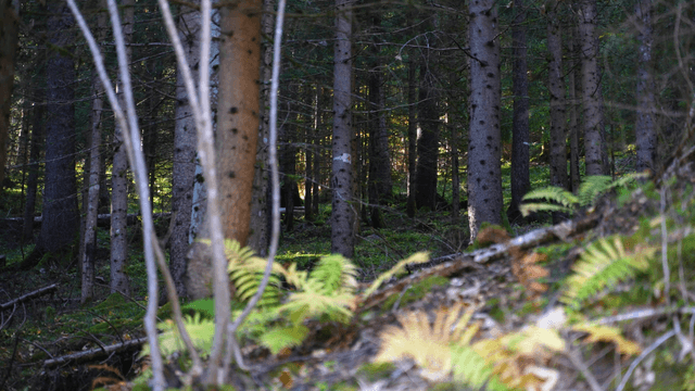 빽빽한 숲 속 나무 사이로 비치는 햇살