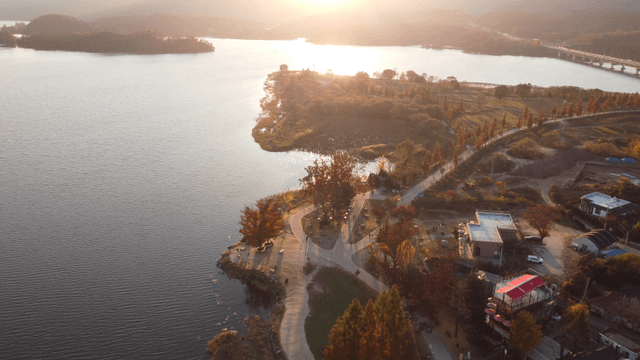 일몰 항구 도시 항구에 유람선이 지나가는 모습