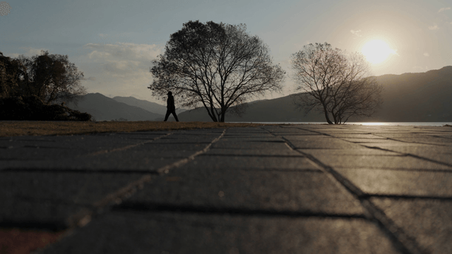고요한 호숫가 일출과 외로운 인물