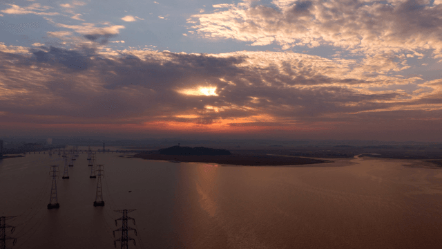 강 위 일몰을 배경으로 이어진 송전탑 전선