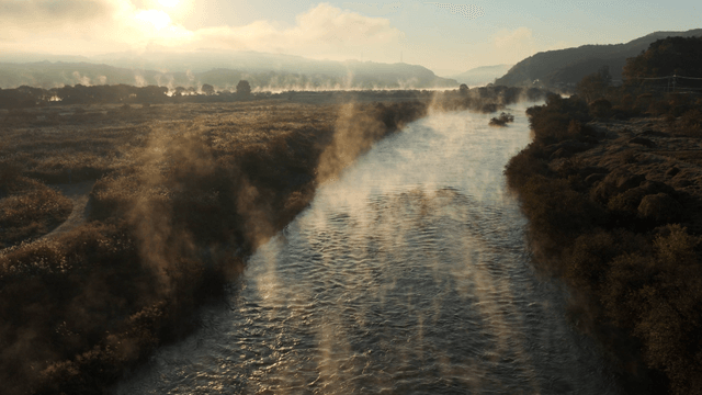 산을 따라 흐르는 안개 낀 강