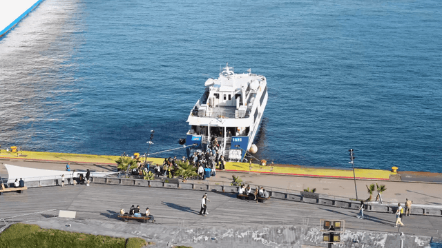 승객들이 있는 햇살이 비치는 항구에 정박한 페리