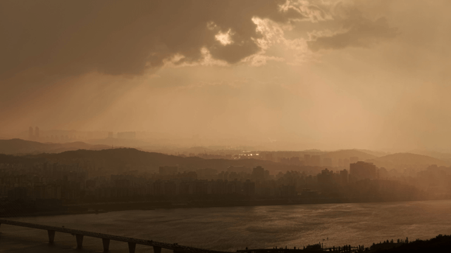 숲이 우거진 언덕에서 본 일몰의 도시 풍경