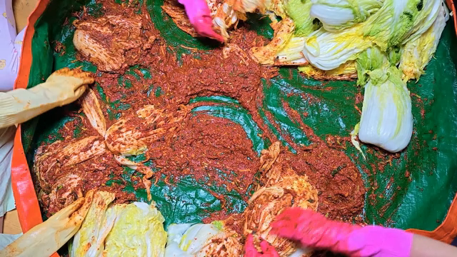 배추에 고추 양념을 넣어 김치를 만드는 모습
