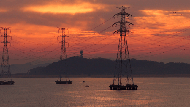 강 위 일몰을 배경으로 이어진 송전탑 전선