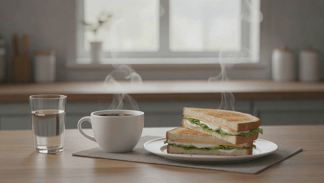 햇살이 비치는 테이블 위의 샌드위치와 커피