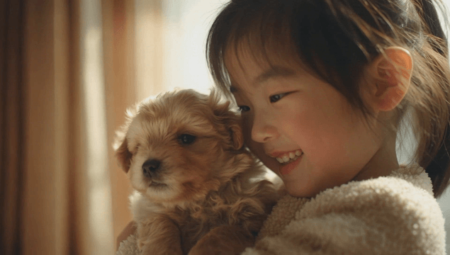 강아지를 안고 정면을 보고 웃고 있는 아이