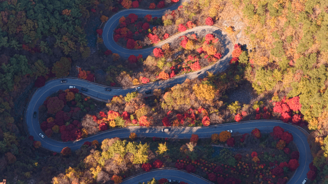 알록달록한 가을 숲을 지나는 구불구불한 도로