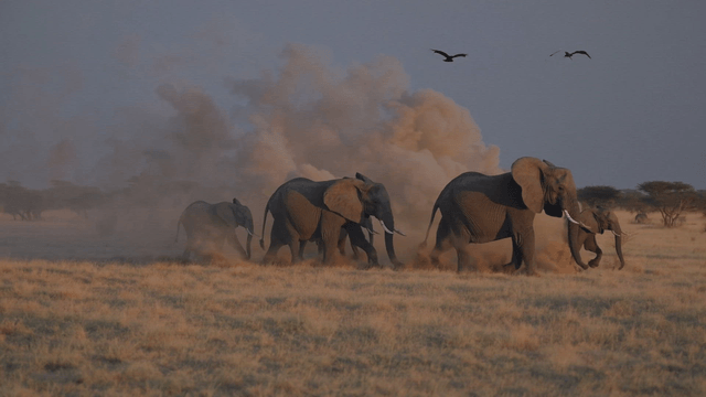 새들이 날아다니는 쓰레기 더미 위를 걷는 코끼리들