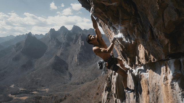 실내 암벽의 다양한 색상의 홀드를 오르는 여성