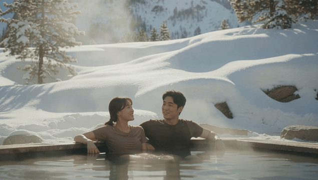 눈 덮인 산에서 온천을 즐기는 커플