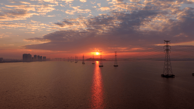 일몰 속 바다 위의 송전탑과 전선