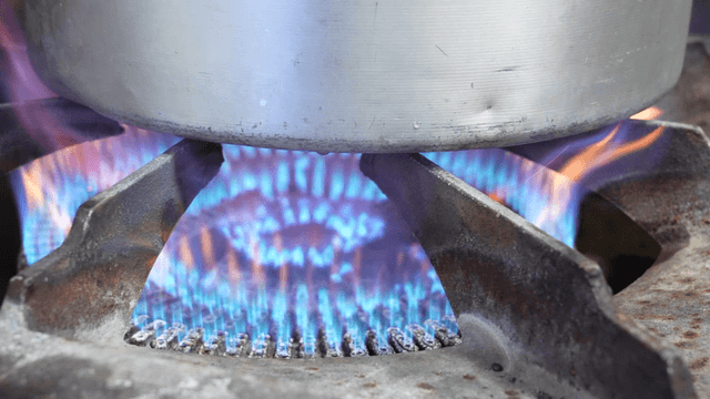 가스레인지 위 냄비를 데우는 파란 불꽃