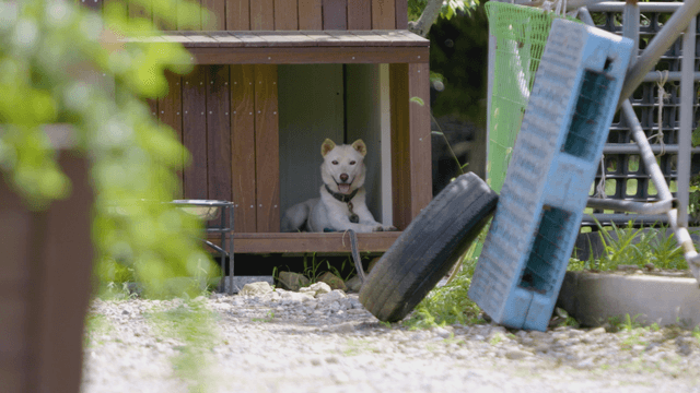 낮에 돌계단 위에 앉아 쉬는 강아지