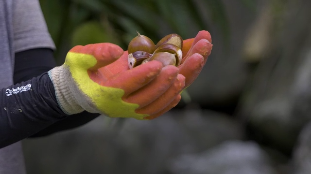 숲에서 삶은 죽순을 새참으로 먹는 사람들