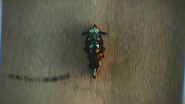나무가 늘어선 길에서 오토바이를 타고 출발하는 운전자