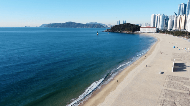 맑은 하늘 아래 고층 건물들이 있는 번잡한 부산의 해운대 해수욕장