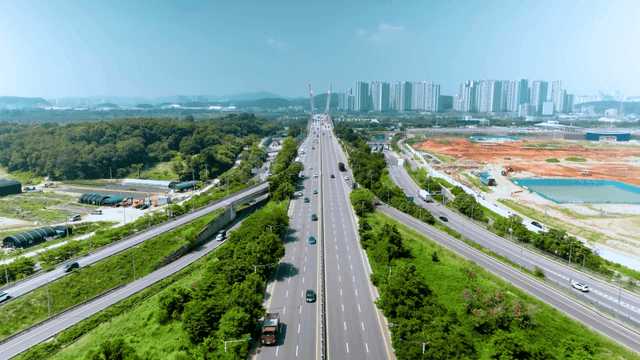녹지로 둘러싸인 고속도로의 항공 뷰