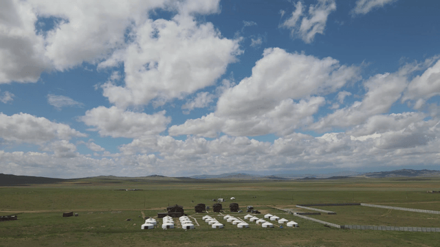 흐린 하늘 아래 광활한 평야에 있는 유르트