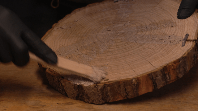 나무 조각에 톱밥 본드 반죽을 올리는 목공예가