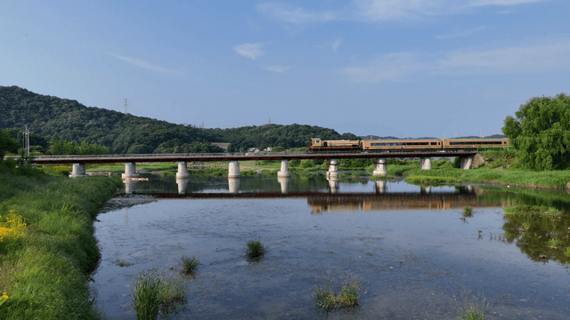 봄철의 따뜻한 풍경 속에 다리 위를 지나는 기차