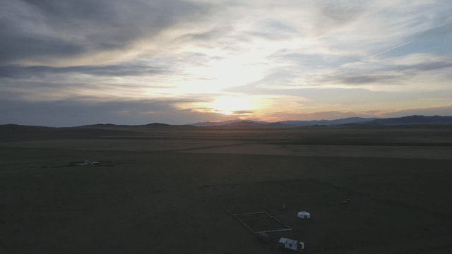 정자가 있는 언덕 너머 넓은 대양 위로 내려앉는 석양