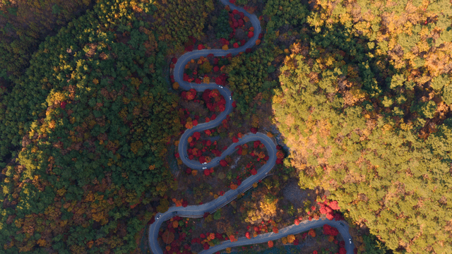알록달록한 가을 숲을 지나는 구불구불한 도로