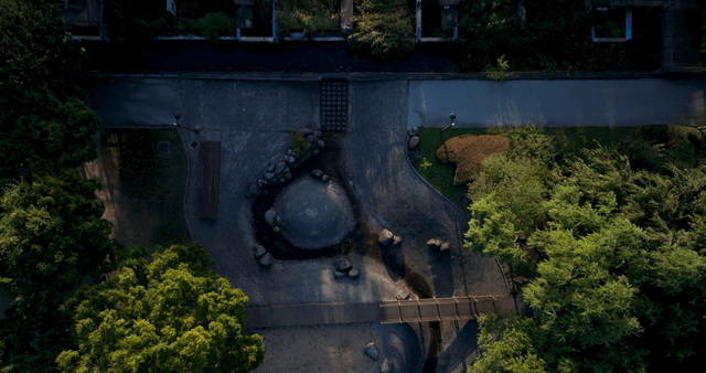 중앙에 조형물이 있는 푸른 나무가 많은 공원