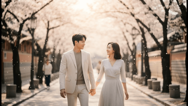 벚꽃이 떨어지는 길거리에서 서로를 바라보는 커플